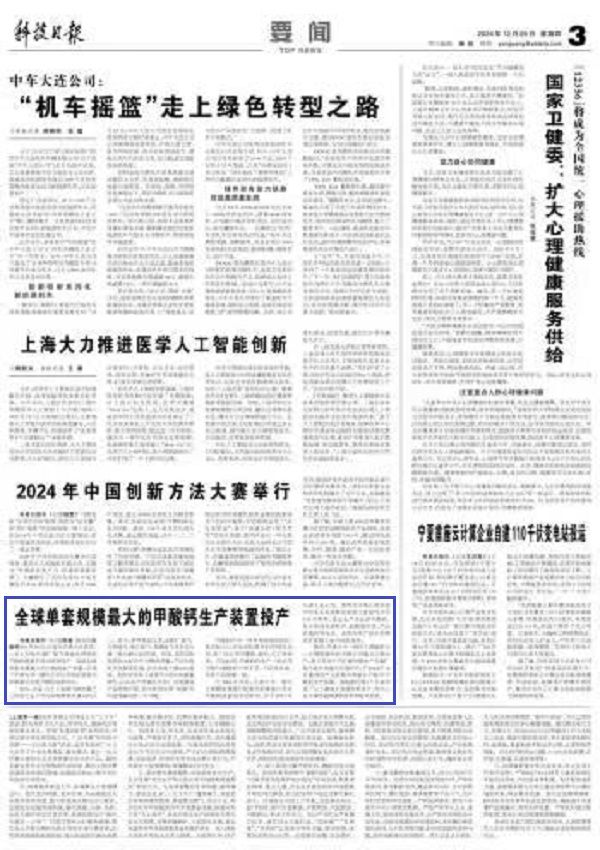 本站讯(记者陈曦 通讯员刘晓艳)12月24日,记者从天津大学获悉,山东5万吨/年钢厂尾气高值化利用制甲酸钙装置于近日顺利投产。这是全球单套规模最大的甲酸钙生产装置,采用了天津大学一碳化工团队开发的氢氧化钙羰基化合成甲酸钙成套技术。