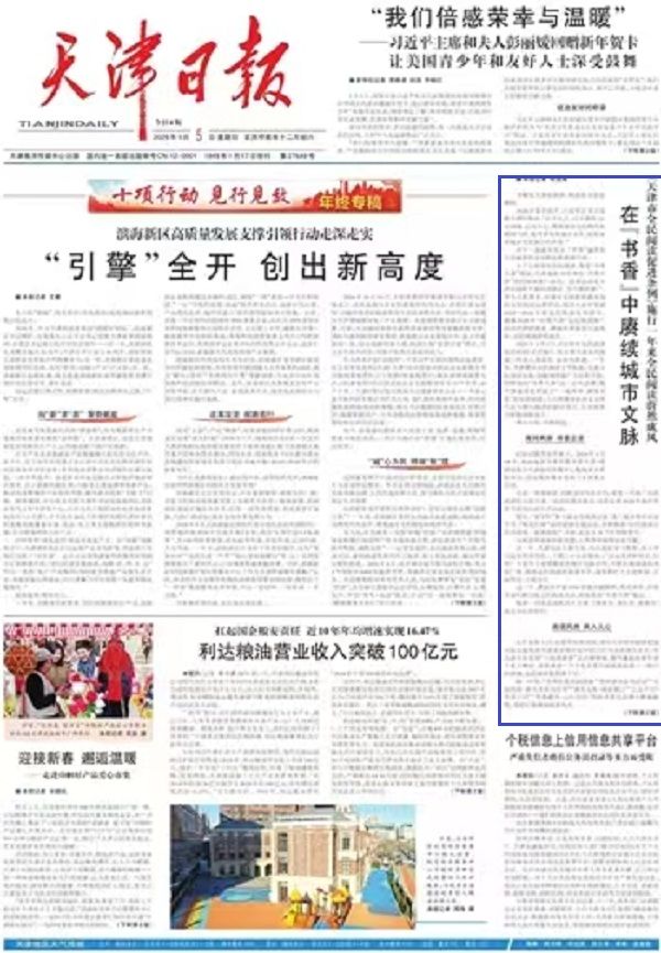 2024年1月1日,《天津市全民阅读促进条例》正式施行,标志着天津全民阅读工作进入规范化、法治化轨道。一年来,天津健全全民阅读工作机制,完善全民阅读设施,创新阅读推广方法和手段,持续深化“书香天津”这一文化品牌,整个津城更是形成了“一城风华 满城书香”的生动局面,为天津建设社会主义现代化大都市提供价值引导力、文化凝聚力和精神推动力。