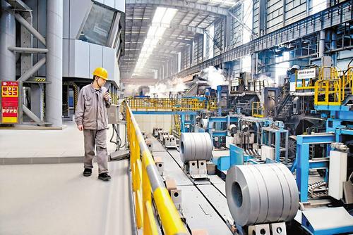 2024年10月,在唐钢2050热轧生产线上,工作人员正在检查卷取工艺优化后的品种钢产品质量。(本报资料片) 赵 辉摄