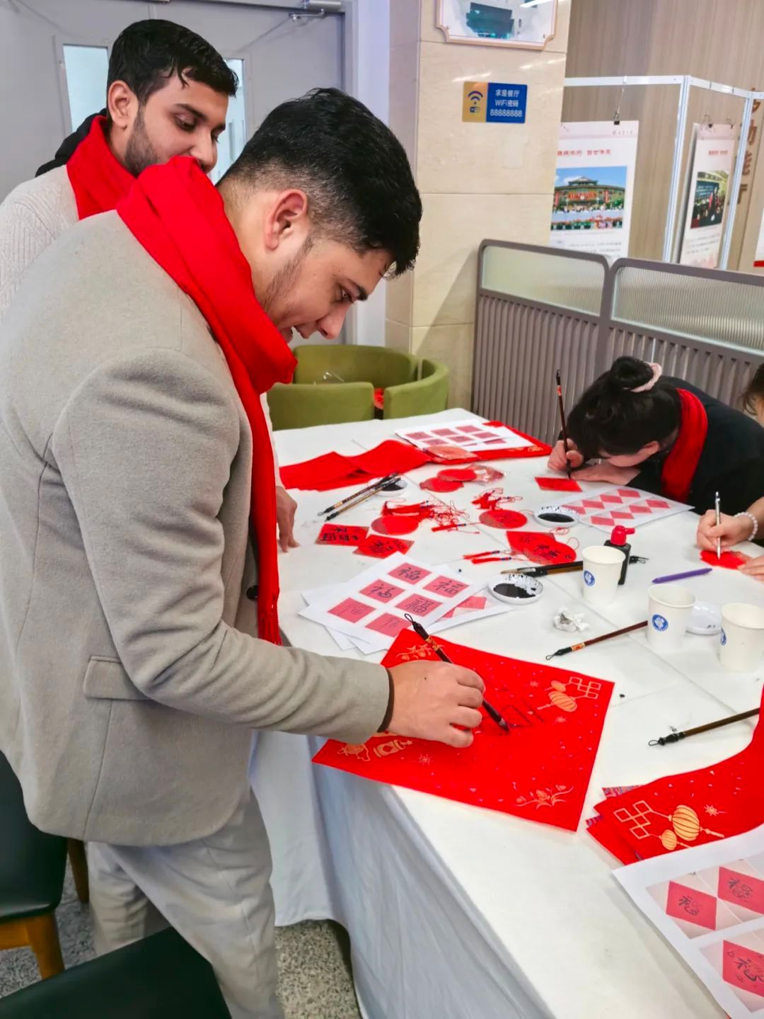 活动中,留学生们系着红色围巾,在写福字、做年画的摊位前围观,有的学生主动上前动手“尝鲜”,一笔一划写了一个“福”字后,开心地拿着作品拍照留念。天津大学国际教育学院党委书记金旋向全体来华留学生致以新春祝福,同时介绍了中国传统新年文化习俗,希望大家珍惜在华学习机会,更加深入了解中国传统文化。