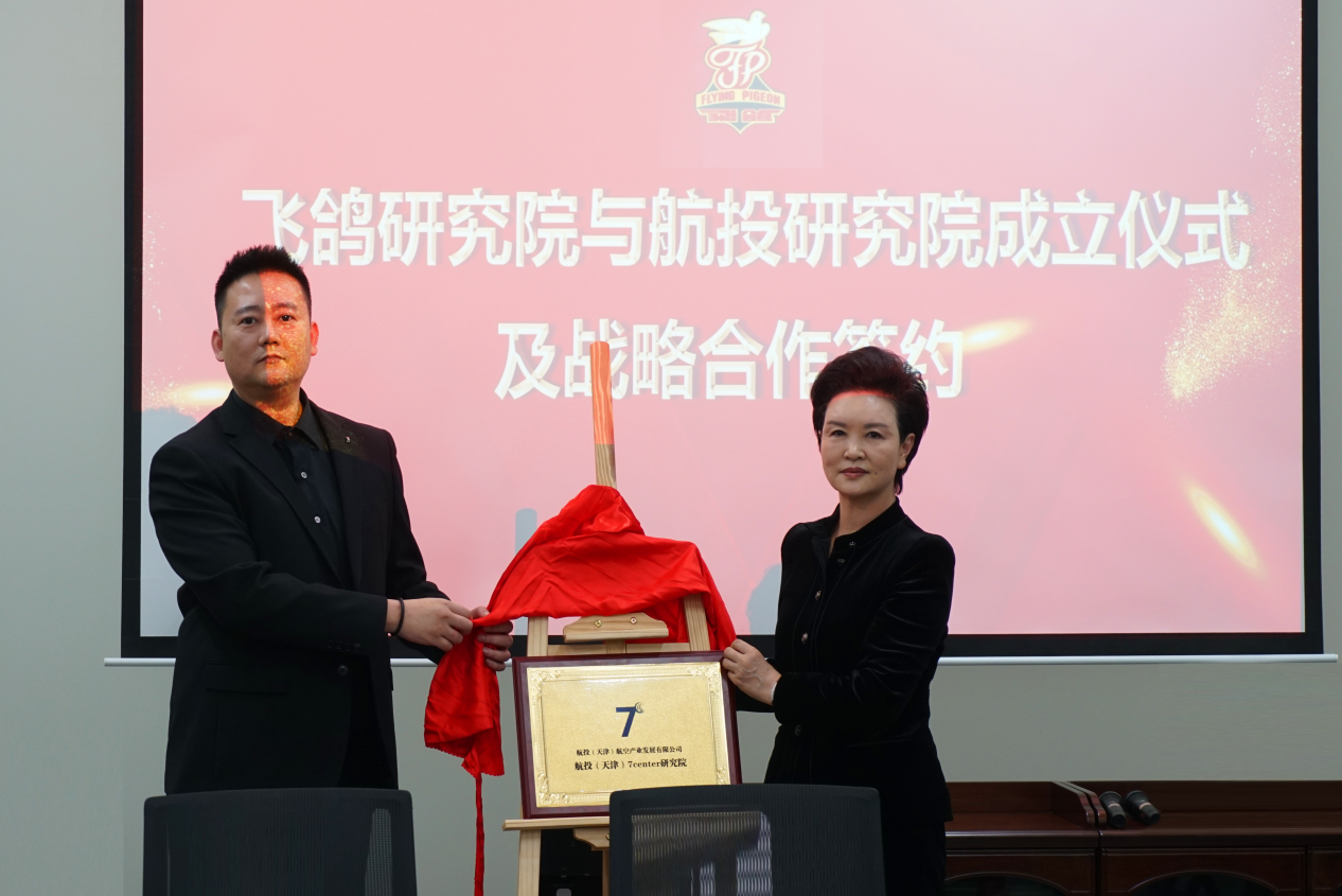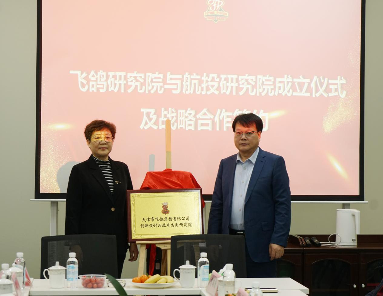 在仪式上,飞鸽集团党委书记兼董事长韩桂友与天津大学工业设计中心执行主任项忠霞教授共同为飞鸽研究院揭牌;航投公司董事长刘秀军与原天津银行行长、航投公司顾问专家石晶共同为航投研究院揭牌。随后,双方签署联合战略协议,这标志着两大研究院将在科技创新、资源整合、产业协同等方面展开深度合作,携手探索跨领域合作的新模式。