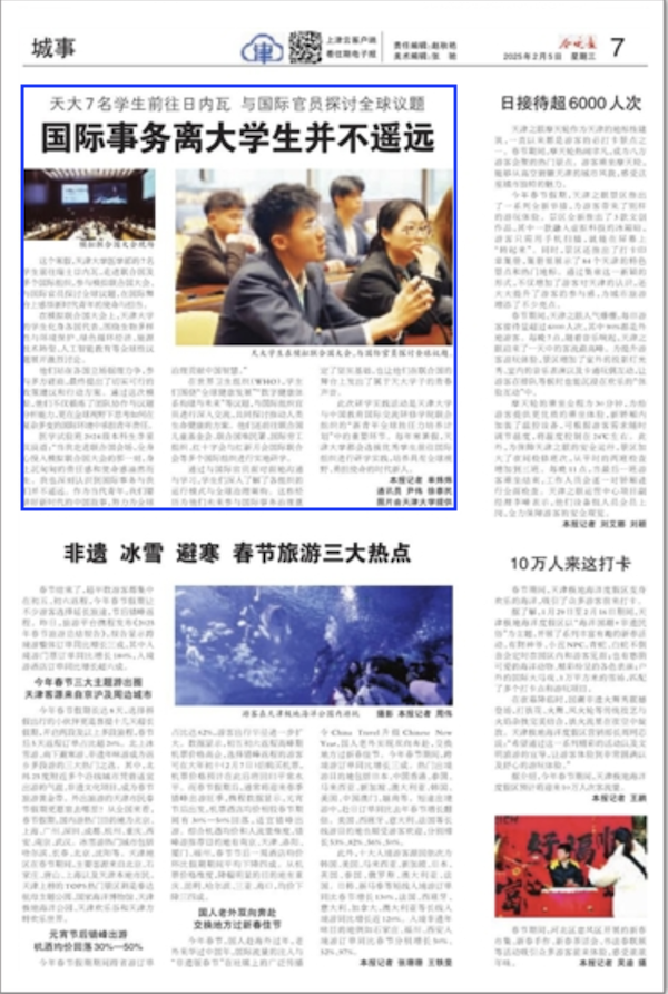 这个寒假,天津大学医学部的7名学生前往瑞士日内瓦,走进联合国及多个国际组织,参与模拟联合国大会、与国际官员探讨全球议题,在国际舞台上感悟新时代青年的使命与担当。