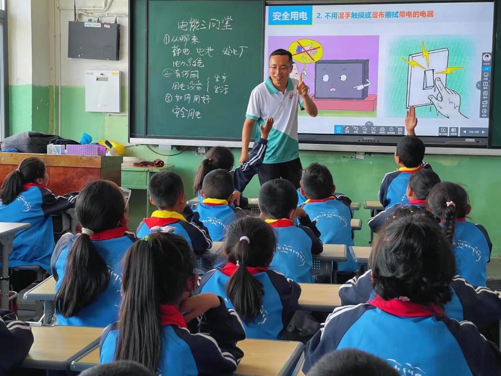 在日喀则市桑珠孜区第一小学,陈晓龙教授为同学们讲授课程《电能三问》。他以藏区孩子能切身感受到的静电和闪电现象作为导入,再层层递进地讲解电池、发电厂、电力系统相关知识,让孩子们清晰地了解到走进千家万户的电能到底从哪里来。陈晓龙还利用丰富形象的用电场景图,从安全用电的角度,强化孩子们的安全用电意识。