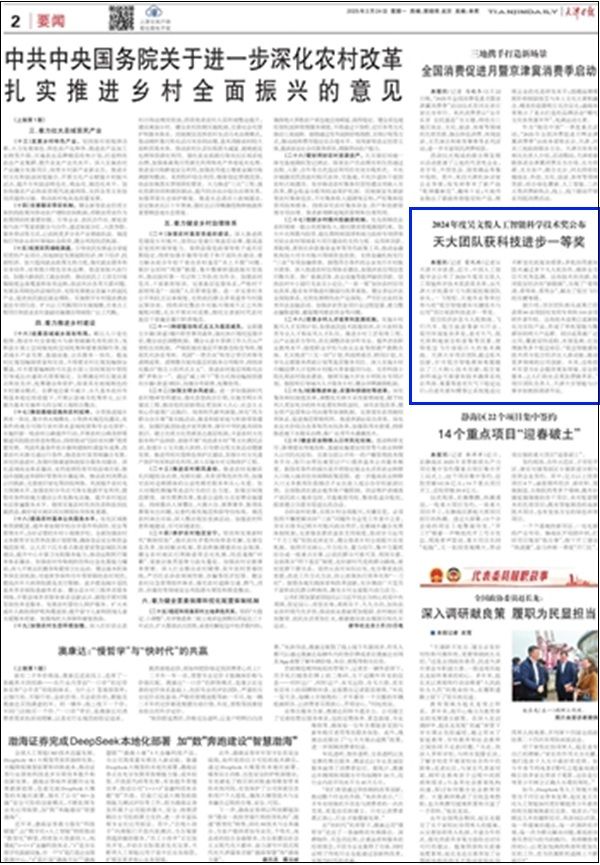 天津日报讯(记者 雷风雨)记者从天津大学获悉,近日,中国人工智能学会公布了2024年度吴文俊人工智能科学技术奖获奖名单,由天津大学机器学习与数据挖掘团队牵头,一飞智控、天地伟业等单位参与的“低空智能感知关键技术与应用”项目荣获科技进步一等奖。