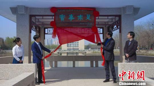 中新网天津4月4日电 (记者 张道正)天津大学3日举行“求是亭”复建启用仪式。天津大学校长钟登华、校友代表赵鉴、设计师吴非、学生代表刘静仪共同为求是亭“实事求是”匾额揭幕。