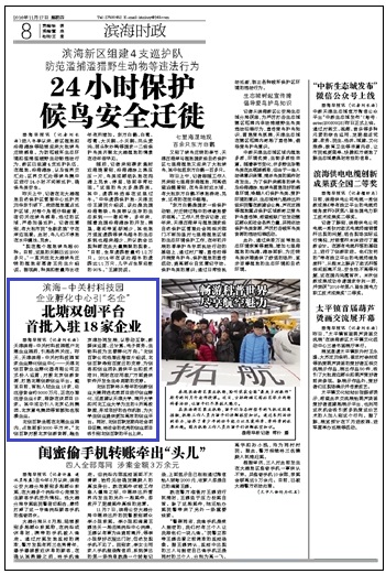 渤海早报讯 (记者刘长海)天津滨海-中关村科技园落户北塘企业园后,引起各界关注。昨天,天津滨海-中关村科技园首家企业孵化创业中心——天津北创百联企业孵化器有限公司正式投入运营,对接北京创新资源,打造北塘创新创业平台。截至目前,首批入驻企业18家,总注册资金约5000万元,正在办理注册企业6家,跟踪在谈项目15家。其中成功引入北京亿利集团、北京富电集团等首都知名规模企业。