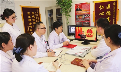 (天津南开医院日间手术中心的医护人员认真收听收看习近平当选国家主席、中央军委主席这一庄严幸福的历史时刻,深受鼓舞,倍感振奋,大家纷纷表示这是党心、军心、民心所向,坚决拥护。本报记者 王倩 摄)