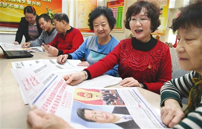 (劝业场街百货大楼社区党员群众通过各种途径关注两会动态。本报记者 吴迪 摄)