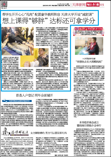 新报讯【记者 信华 通讯员 刘晓艳】天津大学开设21天“减肥课”,校园学子够胖才有“资格”上课。昨天9:00,报名“减肥课”的107名学生来到天津大学体育馆进行“初试”。体测人员对报名学生的体重、三围、BMI进行测量后,专业老师还对报名学生的体能进行了简单测试:包括身体骨盆灵活度、脊柱和四肢力量测试以及脊柱灵活性测试等。