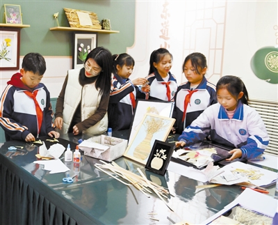 在稻梦空间美育工坊,稻秆在学生们的巧手下获得了新生命。老师手把手教孩子们把看似平凡的稻秆编织、拼接、粘贴,创作出一幅幅精美的稻秆画和一件件独具匠心的手工艺品。金葵工坊的缝纫机嗡嗡声不时响起。孩子们在老师带领下学习缝纫技巧,小心翼翼地裁剪布料,专注地缝制抱枕、香囊。