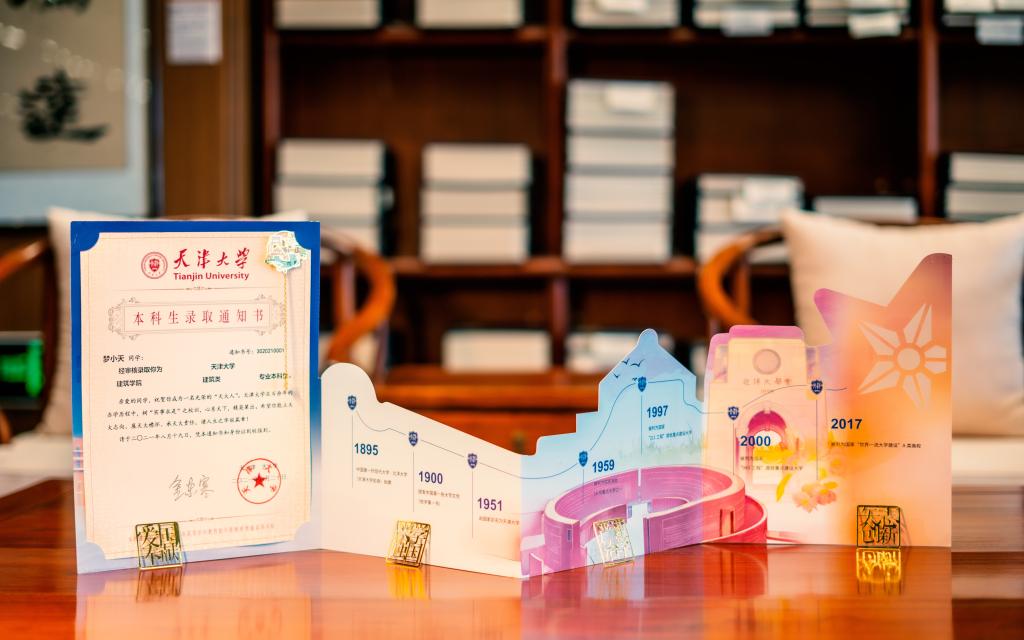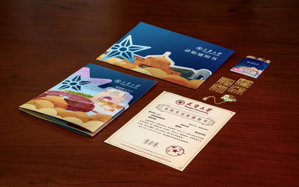 今年天津大学录取通知书以“逐梦星空 圆梦天大”为主题,其创意来自一颗以天津大学校名命名的小行星——8917号·天津大学星。通知书封面采用“天大之星”镂空设计,与8917星上的纪念亭和宣怀广场交相辉映。通知书采用折叠式设计,展开后罗列着天津大学重要历史节点。