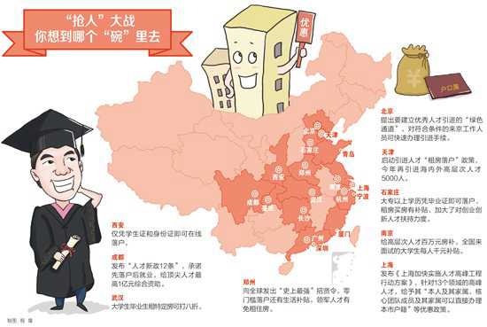 这场人才大战带来的一个直接影响,是给僵化已久、备受诟病的户籍政策松了绑。李侠说,人才流动将带来资源要素的重新流向,给改革注入一剂强心针。各地人才新政的成色与人才“用脚投票”的成果,无疑将绘制出中国未来经济版图的新样板。