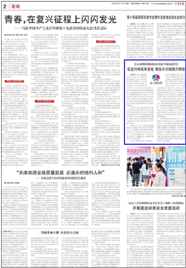 本报讯(记者 张雯婧)6月18日,在天开高教科创园开园满月之际,市教育两委会同市科技局、市工业和信息化局、市知识产权局、市工商联、南开区人民政府,携手南开大学、天津大学等15所高校、80余家高新技术企业和金融机构走进天开高教科创园,举办“校企紧握手”专题系列活动·第五场──天开高教科创园校企对接专场,联合“政产学研金介服”搭建握手通道,为入驻天开园项目提供高质量服务,助力更多优质科研成果在天开园落地转化。
