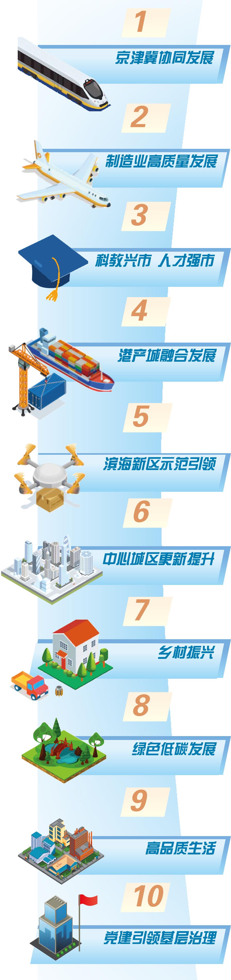 天津切实把党的二十大作出的重大决策部署付诸行动、见诸成效,着眼今后五年,围绕全面建设高质量发展、高水平改革开放、高效能治理、高品质生活的社会主义现代化大都市的目标导向,聚焦事关天津长远发展的重点领域,组织实施十项行动。
