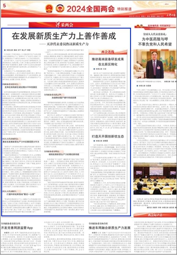 今年全国两会上,来自天津的代表委员表示,要牢记总书记的殷殷嘱托,紧紧围绕新质生产力的发展需求,就如何充分发挥科技创新的增量器作用,在发展新质生产力上善作善成,谈思路、话举措、谋未来。