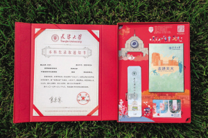 这个夏天,每一名即将走进天津大学的本科新生都将收到一份红红火火的“天大+”大礼包。除了录取通知书一份,礼包里还包括天大校徽、天大简史、电子秘钥、书签、手绘地图等特色礼物。