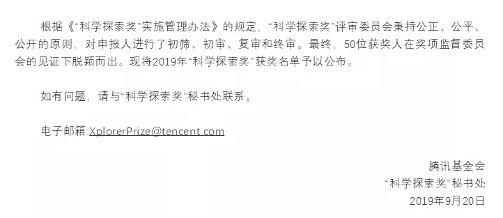 “作为一个社会公益性奖项, ‘科学探索奖’ 的各项方案正逐步完善。我们将秉持公平、公正、公开的原则,确保奖项合法合规、公正有序。鼓励青年人心无旁骛的去探索。” “科学探索奖” 监督委员会表示。