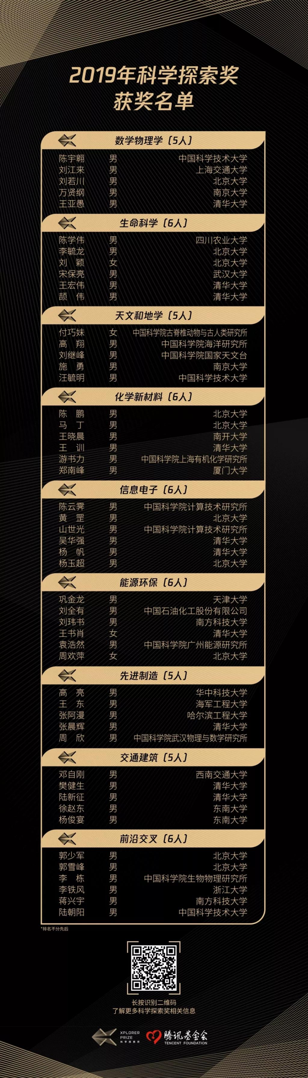 “科学探索奖”由腾讯公司董事会主席兼首席执行官、腾讯基金会发起人马化腾,与北京大学教授饶毅,携手杨振宁、毛淑德、何华武、邬贺铨、李培根、陈十一、张益唐、施一公、高文、谢克昌、程泰宁、谢晓亮、潘建伟等知名科学家共同发起。面向基础科学和前沿技术领域,支持在中国大陆全职工作的、45周岁及以下青年科技工作者的公益奖项。“科学探索奖”由腾讯基金会长期运营,每年将评出50位获奖人。
