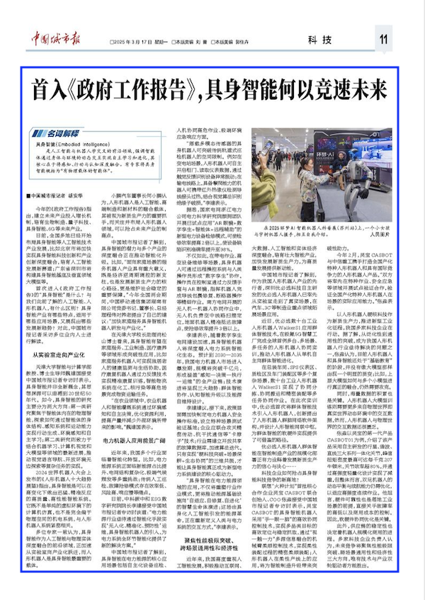 首次进入《政府工作报告》的“具身智能”是什么?与我们此前了解的人工智能、人形机器人,有什么区别?具身智能产业有哪些特点,适用于哪些应用场景,又展现出哪些发展新趋势?对此,中国城市报记者采访多位业内人士进行解读。