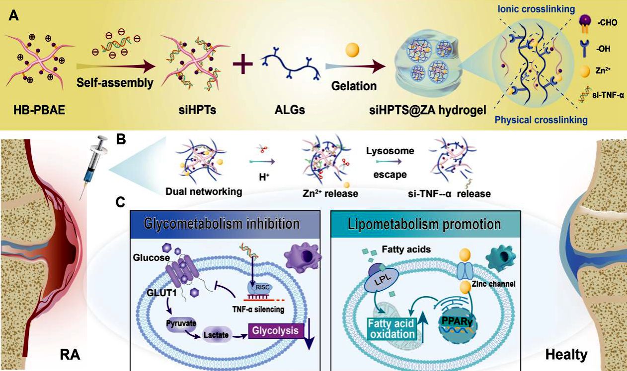 天津大学李楠课题组研发的新型水凝胶以可降解的海藻酸盐为基底,形成了一种双网络结构。这种水凝胶具有良好的可注射性和可控释性,被注射到关节内后,它会根据病变部位的酸性环境,逐步释放锌离子和小干扰核糖核酸,抑制促炎巨噬细胞的糖酵解代谢途径,从而减少炎症反应,增强其抗炎功能。这种“代谢重编程”机制,能够精准调控免疫细胞的代谢模式,从根本上缓解类风湿性关节炎的炎症反应。