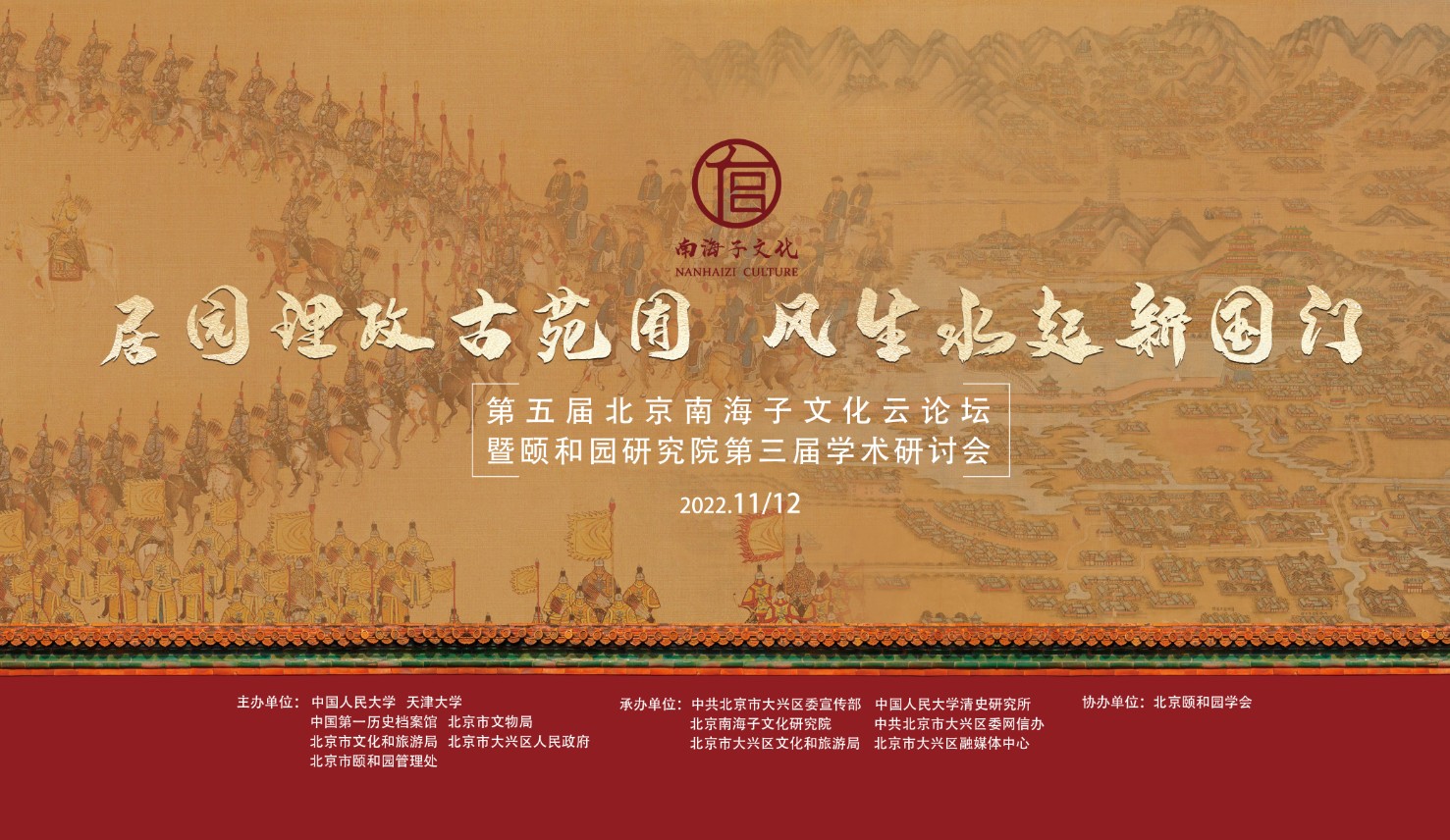 “居园理政古苑囿 风生水起新国门”第五届北京南海子文化云论坛暨颐和园研究院第三届学术研讨会将于11月12日15:00在央视频移动网、新华社现场云、网易新闻、优酷视频直播。本次活动由中国人民大学、天津大学、中国第一历史档案馆、北京市文物局、北京市文化和旅游局、北京市大兴区人民政府、北京市颐和园管理处联合主办,中共北京市大兴区委宣传部、中国人民大学清史研究所、北京南海子文化研究院等多家单位承办。