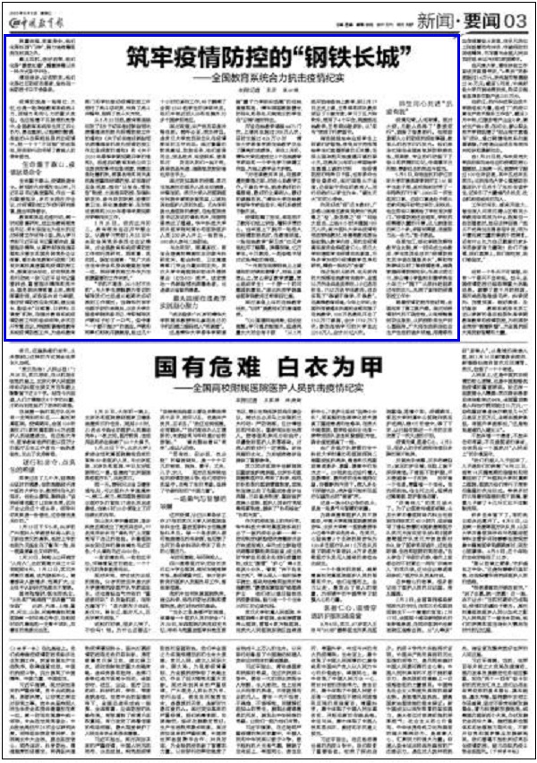 疫情防控是一场硬仗、大仗,也是一场考验教育系统战斗力、团结力和向心力的重大战役。在这场看不见硝烟的战争中,全国教育系统师生员工齐心协力,勇往直前,以饱满的激情、昂扬的斗志积极投身抗击疫情中,把一个个“不可能”变成现实,用实际行动书写了教育人的使命担当。