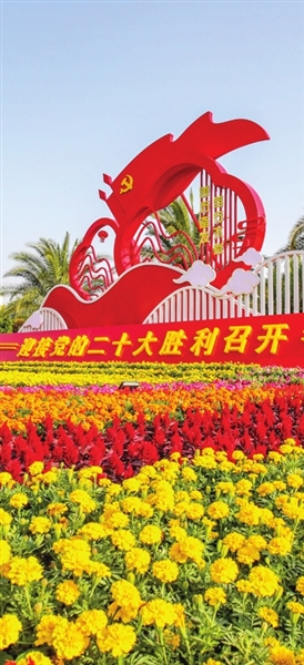 西青区杨柳青广场以“山河添锦绣 喜迎新征程”为主题,打造大型景观,营造浓郁节日气氛。 通讯员 袁忠清 田建 本报记者 潘立峰 摄
