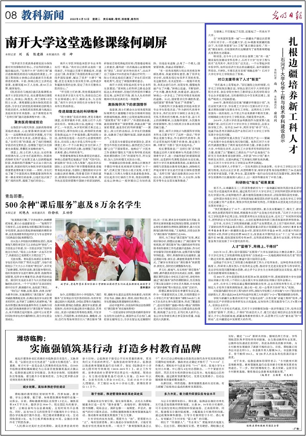 这得益于化学化工学院着力构建的新工科人才培养体系。这种培养体系将实践育人、科研育人落实到人才培养的全过程,推动学生走进实验室参与科学研究,走出学校发现问题和解决思路,成立多个以学生为主体的创新创业实验室,提升学生的创新精神和实践能力。