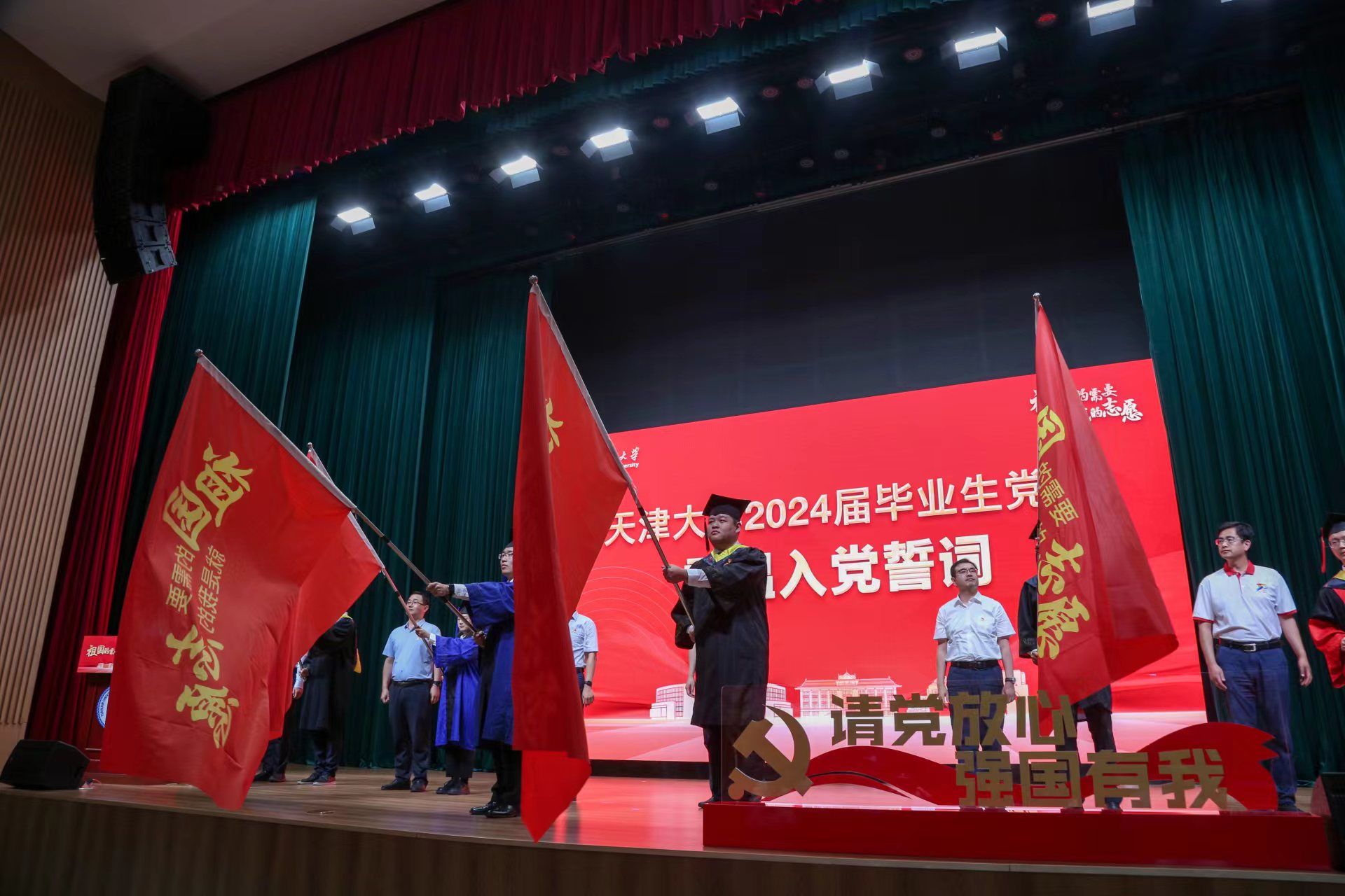 活动现场,毕业生党员代表们从所在学院院级党组织书记手中接过书写着“祖国的需要就是我的志愿”的旗帜,承载着殷殷嘱托,同学们即将到基层和人民中去建功立业,让青春之花绽放在祖国最需要的地方。在校党委副书记韩庆华的带领下,全体师生党员现场重温入党誓词,激励同学们赓续红色基因,凝聚奋进力量,在实现中国梦的伟大实践中书写别样精彩的人生。
