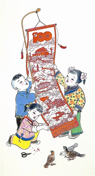四川省级非物质文化遗产传承人、绵竹年画博物馆馆长胡光葵,创作了年画《红色传承人》(上图)。作品是以三个少年儿童制作一幅剪纸作品为主体,吸收传统年画的表现手法,用细腻的笔触和鲜艳的色彩精心制作而成。画中的剪纸图案由中国共产党召开“一大”的南湖红船、“八一南昌起义”、遵义会议会址、革命圣地延安、天安门城楼等组成,体现了中国共产党成立100周年的光辉历程。