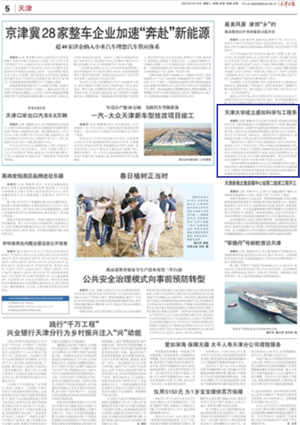 本报讯(记者 姜凝)昨天从天津大学获悉,该校精仪学院感知科学与工程系获批成立,旨在瞄准新质生产力发展,满足国家对先进传感技术、高端科学仪器装备和智能技术的迫切需求。据了解,天津大学是全国首批智能感知工程本科专业开设高校,该专业今年将有第一批毕业生。感知科学与工程系的成立,意味着该专业进入实体运行和专业化管理的新发展阶段。