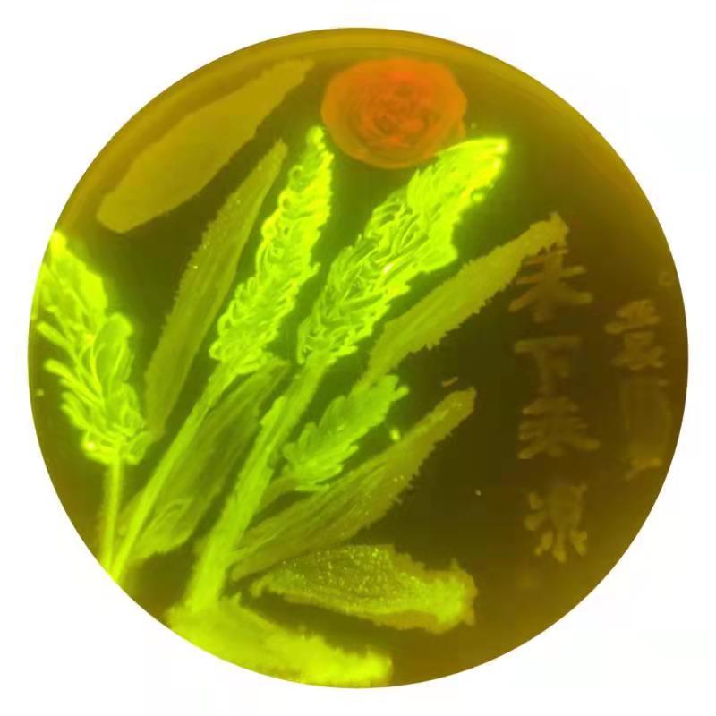 12月24日,天津大学化工学院2019级生物工程二班的学生秦雨珂在自己的朋友圈晒了一张由萌萌的小老虎和2022字样组成的图案。这个图案是她用导入了红色荧光蛋白和绿色荧光蛋白的大肠杆菌在培养基中完成的,而“微生物绘画”正是她本学期“微生物学实验课”期末考试的内容之一。