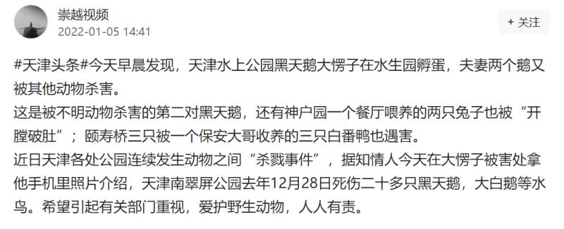 津云新闻讯:近日,有热心市民发帖反映,生活在水上公园、南翠屏公园的黑天鹅等被“被不明动物杀害”。面对连续发生的动物之间“杀戮事件”,记者联系到了园方,试图找出事情真相。