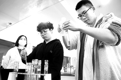3月22日,南通科技职业学院学生在实验室进行水质中总磷的测定实验。徐培钦摄/光明图片