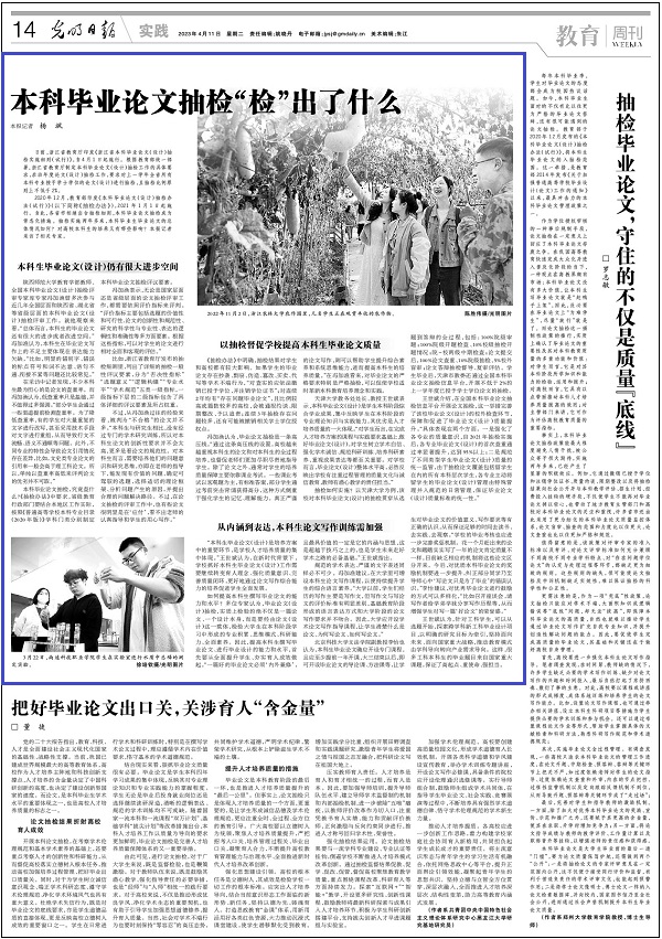 如何提高本科生撰写毕业论文的能力和水平?多位专家认为,毕业论文(设计)抽检,实质上检验的绝不仅是一篇论文、一个设计本身,而是要经由论文(设计)这一载体,检验大学生在本科阶段学习中形成的专业积累、思维模式、科研能力、全面素养。因此,提高本科生撰写毕业论文、进行毕业设计的能力和水平,首先要从全面提升学生、夯实育人成效做起。“一篇好的毕业论文必须‘内外兼修’,且最具价值的一定是它的内涵与思想,这是超越于技巧之上的,也是学生未来走好学术之路的必备基础。”王世斌指出。