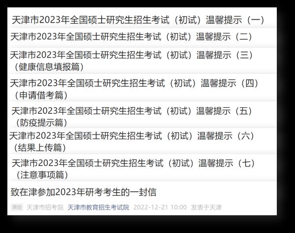 市考试院通过官网官微,陆续发布七期温馨提示和致考生的一封信;各考区精心策划考研提示,点对点进行个性化考前提示;高校为在校备考的学生推出温馨助考系列举措,为考生加油鼓劲。