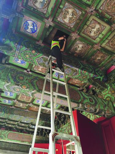 这种感觉,刚刚结束李纯祠堂测绘的天大本科生罗新程也体会到了。在此次测绘中,他负责的是对正殿的测绘。当他站上脚手架,打开尘封多年的天花,看到大殿内部精巧的梁架结构时,那种来自古人智慧的震撼让他记忆深刻。“那是一种看到历史的感觉。”罗新程说。