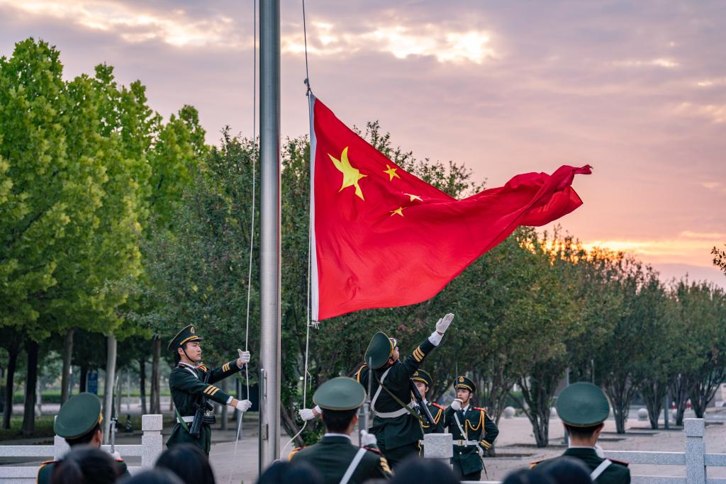 “十一正确的打开方式,当然要从早早起床看升旗开始!”10月1日清晨,天津大学在北洋园校区举行升旗仪式。国旗护卫队身姿挺拔、步伐整齐,披着朝阳护卫国旗徐徐走来。伴随着国歌响起,升旗手振臂一挥,鲜艳的五星红旗在数百名师生庄严的注目礼中缓缓上升。“从青涩懵懂到成熟自信,天津大学教会了我一个重要的词——家国情怀。”天津大学十佳杰出青年程启帆作为学生代表在国旗下发表演讲,表达天大学子对祖国的热爱与担当。“先辈夙愿在心,民族大任在肩!让我们接过中华民族伟大复兴的历史接力棒,在新征程上谱写新的辉煌!”。