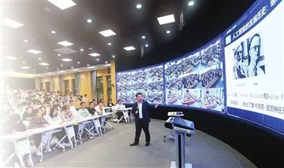 “我每次备课时都会准备大量案例,把理论知识与所教学生的专业结合,在线下面对面教学时针对不同专业学生上课时听课的具体情况进行扩展。”天津大学智能与计算学部教授杨柳说,“我们要用通俗易懂的语言,带领不同专业背景的同学由浅入深、有趣轻松地学懂AI。希望借助人工智能通识课这一平台,能使人工智能和更多学科进行交叉融合,提升学生人工智能素养,帮助学生形成新的思维方式。”同时,天津大学这学期启用全景教学空间开展授课,两校区升级了140余间智慧教室,通过全景智能板书、AI助教等,为教学全环节注入AI技术。