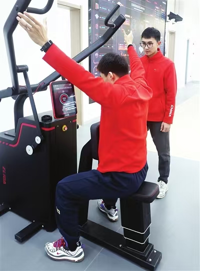 天津体育学院数字体能中心,学生进行瞬间臂力测试。