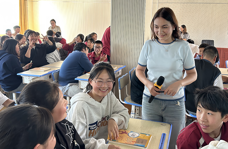 聊建筑、玩游戏、讲美食……在南阳中学九年一班的英语课堂上,两名天津大学留学生——来自索马里的阿布什和乌兹别克斯坦的徐小涵为200余名中学生带来了精彩的英语教学体验。他们设计了生动有趣的游戏、歌曲和对话,让这场英语学习变得轻松愉快,同学们不时爆发阵阵欢声笑语;在宕昌岷江幼儿园,留学生用中英双语讲解配合生动的肢体语言,与孩子们愉快地互动游戏,带去欢乐和启迪。