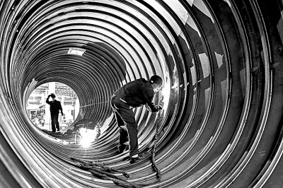 11月3日,江苏省连云港中远海运特种装备制造有限公司生产车间,工人正在进行罐箱加强圈焊接。王健民摄/光明图片