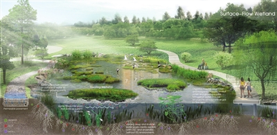 面对如此大规模的规划,王焱团队当时提出了一套系统性的修复手法。“因为我们修复的对象不只是人,而是整个生态圈,包括动物、植物、人类及其活动,所以我们根据动物和植物的不同类型,提供了一系列因地制宜的包括栖息地建设的策略,比如青蛙、兔子、鸟类的栖息地各应怎样建设,种植一些坚果以吸引鸟类回来,以及结合公园土壤水文情况,选择合适的植物品种,丰富植被类型,形成独具特色的景观效果等等,尽力把场地恢复到原生状态。”