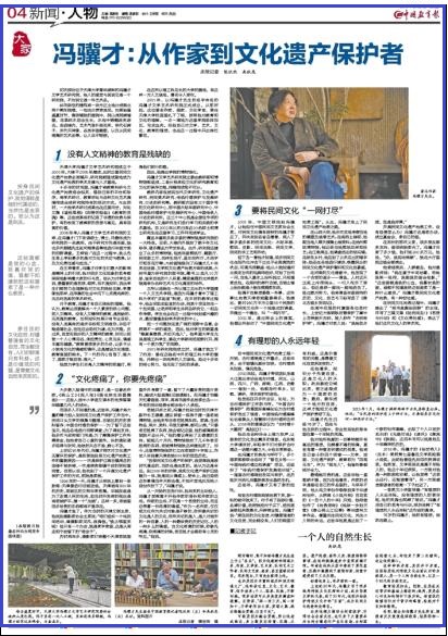 “投身民间文化遗产的保护,我觉得我是被时代逼迫的,当然也是由衷的。我认为这是命运。到2000年的时候,我和文化遗产保护已经融为一体,就是说从情感上、使命上,我已经把这件事情当作天职去做,不知不觉地反而把小说创作放下了。”冯骥才说。