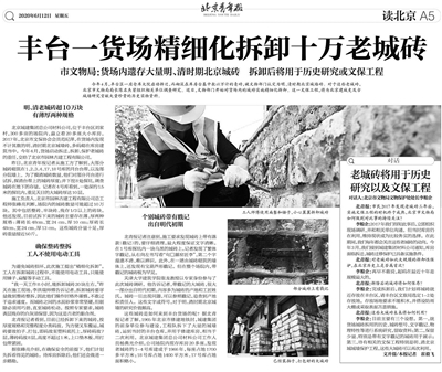 今天是国际古迹遗址日。北京青年报记者近日从市文物局等多部门获悉,本报2020年6月12日报道的“丰台一货场精细化拆卸十万老城砖”一事又有了最新进展。这批“藏身”丰台区一座货场内的老城砖究竟出自何地?为何会流落至丰台区?砖文中包含了哪些历史信息?为破解诸多疑问,北京古建筑研究院(天津大学)中国古代青砖研究团队发挥自身科研优势,于近日完成了对丰台货场城砖的专题研究。