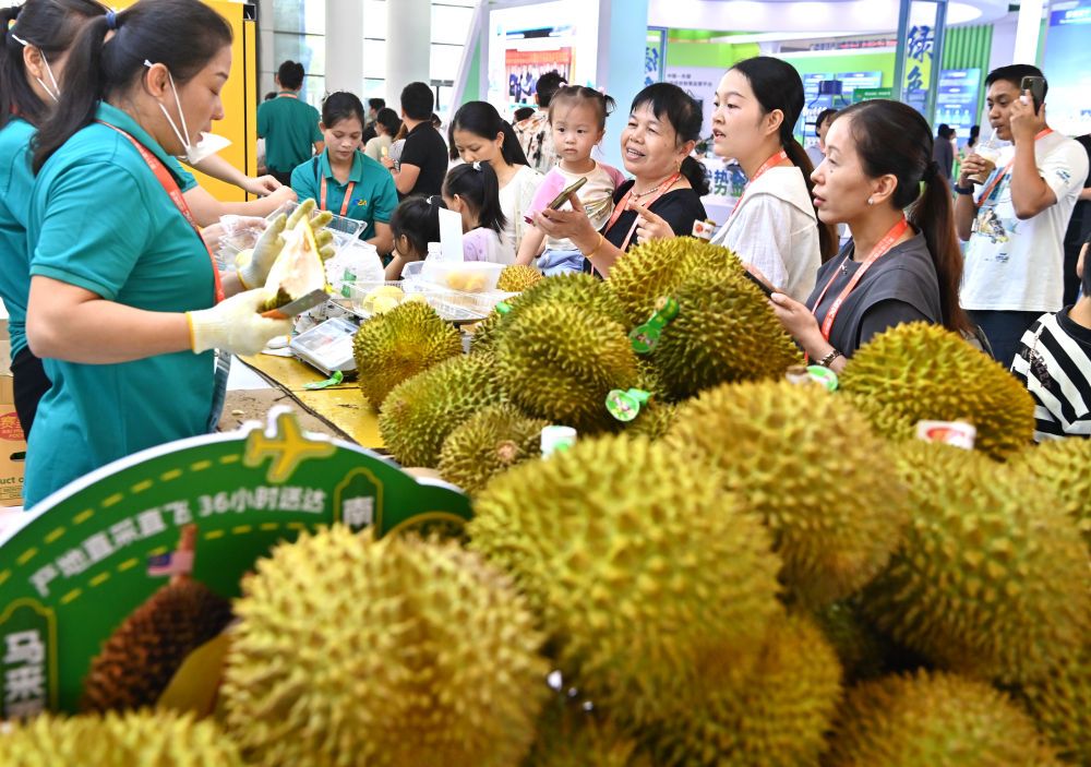 2024年9月28日,观众在中国-东盟博览会上挑选马来西亚榴莲。新华社记者周华摄