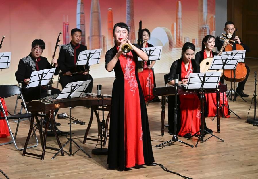 2023年11月24日,在马来西亚雪兰莪州的厦门大学马来西亚分校,艺术家在音乐会上演奏。“丝路粤韵——广东民族音乐会”当晚在厦门大学马来西亚分校举办。新华社记者程一恒摄