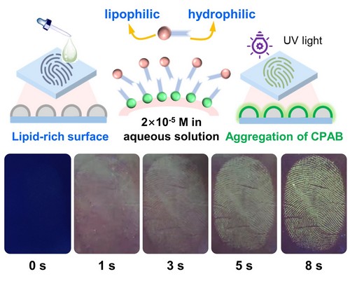 李振、谢育俊团队研发了一种新型两亲性指纹显影剂。这种显影剂在空气中研磨可使其发光颜色产生变化,还可以自行恢复;该显影剂以水作为溶剂,不仅避免了对指纹精细结构的破坏,而且在各种基质均有良好的显影效果。特别值得一提的是,该显影剂不仅工作浓度低、显影时间短,而且其获得指纹显影图像的分辨率极高,对三级指纹细节尤其具有非常清晰的可视化效果。