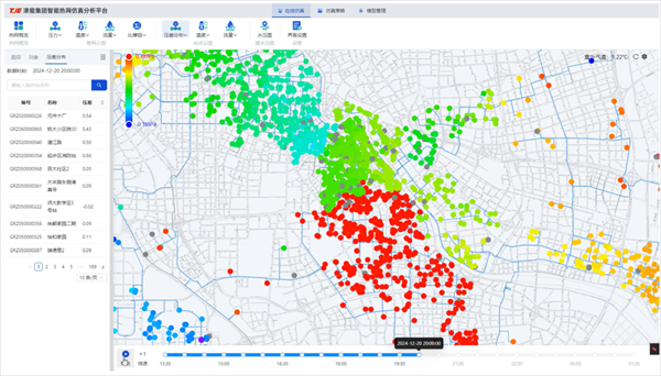 天津市中心城区大热网1800余个换热站动态压差分布的在线仿真。