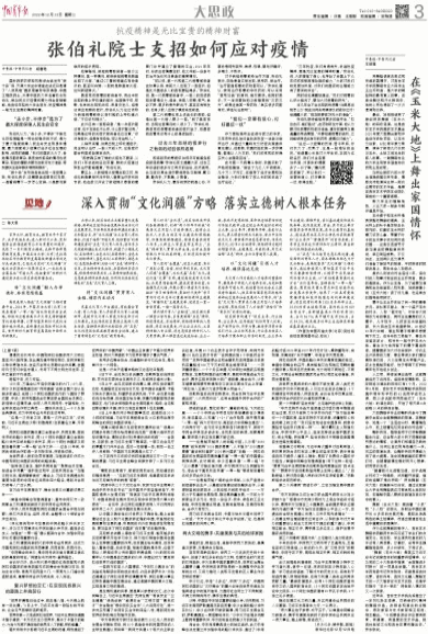 12月13日,中国青年报第3版刊发《张伯礼院士支招如何应对疫情》。国务院联防联控机制综合组发布“新十条”后,天津大学空中课堂在线近日邀请了“人民英雄”国家荣誉称号获得者、中国工程院院士、天津中医药大学名誉校长张伯礼,就如何应对疫情问题为师生答疑解惑。他告诉年轻的大学生朋友,抗疫精神是一笔无比宝贵的精神财富。